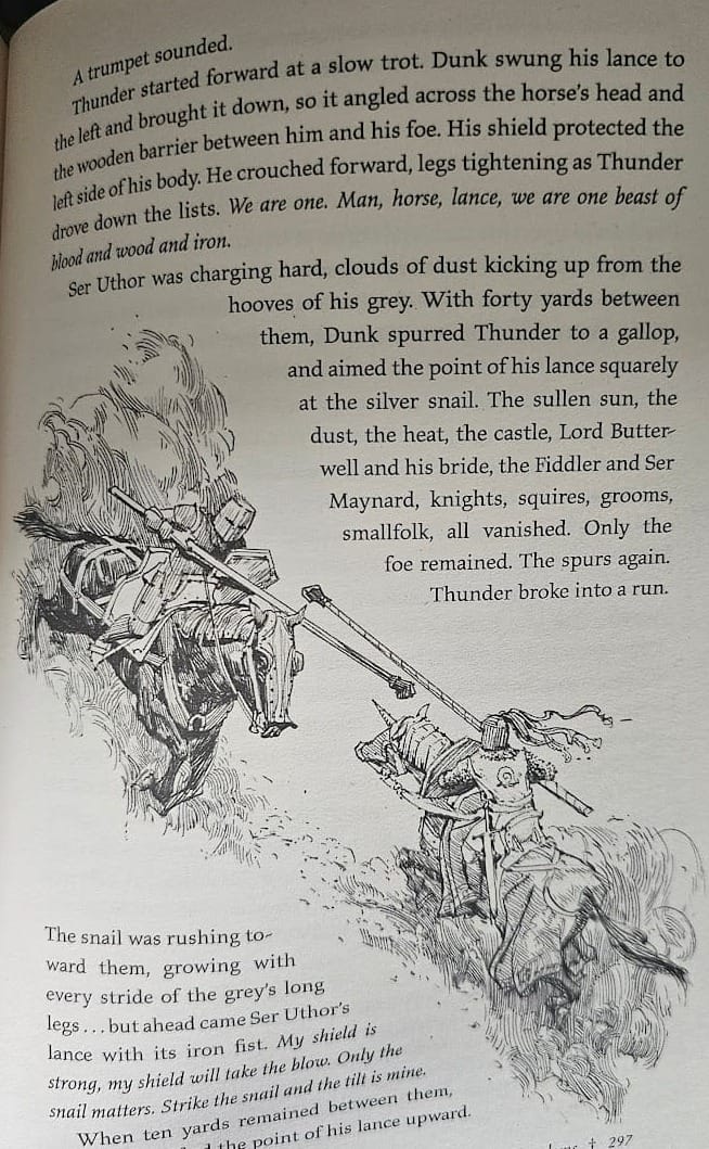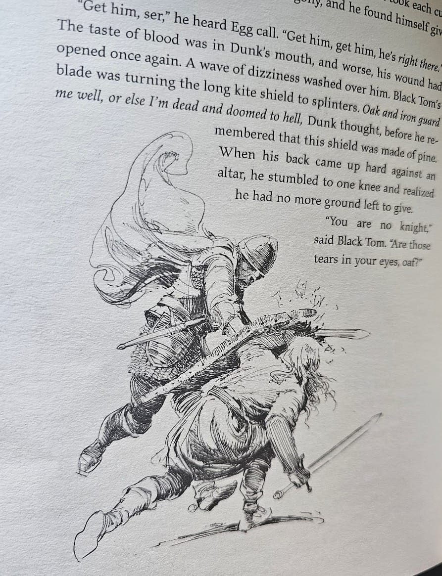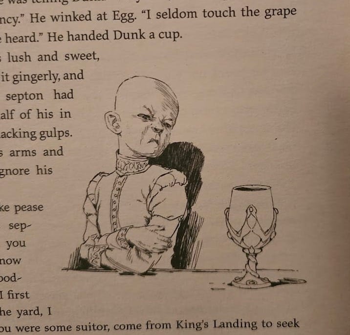 As you can probably already tell, these novellas have a much lighter, comedic tone than that of ASOIAF. Personally, I loved this. It was so refreshing to have a different, more fun perspective in the same gritty world we all know and love. Ser Duncan is a self proclaimed lunkhead and is outwitted by his squire, Egg, on numerous occasions, warranting Egg a 'good clout on the ear'. The relationship they have together is honestly so wholesome and just plain fun. I really wasn’t expecting this to be as comedic as it was.