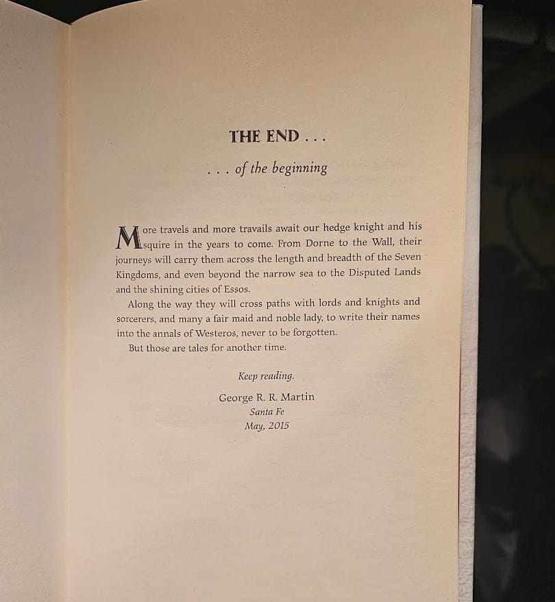The absolute nerve of this man! I was honestly quite happy after finishing the last page, reflecting on the fun times I've had spent with these characters. But no, George R.R. Martin just has to go and ruin it by feeding us empty promises and lies. I don’t want to know that there’s more stories of Dunc and Egg coming, because we all know it’s never gonna happen! It’s fine. I’m fine. I’m over it. That ASOIF reread definitely isn’t gonna happen now, that’s for sure.