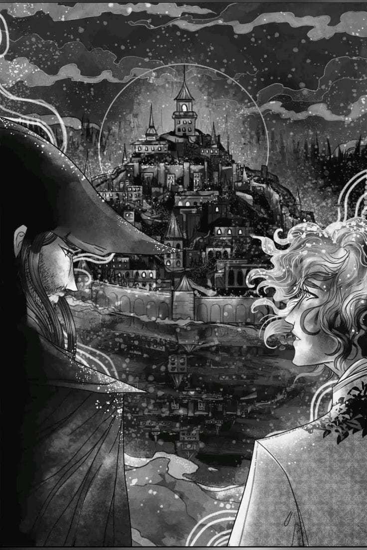 Since I received a physical copy at the book event, I decided to immersion read (simultaneously read and listen to the book) from the point I had already reached. This was very exciting, as it meant that I could experience the illustrations in real time, as opposed to looking them up once I had finished the audiobook, which I did previously. Whilst I still enjoyed the illustrations, and appreciate them greatly (More books need pictures!), I did find that the quality of the drawings dipped in comparison to the previous two books. There is a distinct difference in art style, which personally didn’t connect with me as much. Where before the style was distinctively hand drawn and incredibly dark and gothic, the new style felt less unique and more computer generated. I have no idea if this is true, it’s hard to explain. It almost felt like certain aspects of the drawings, such as the people, were superimposed onto the background. Often with harsh outlines creating this almost green screen effect, instead of forming one cohesive illustration that all comes together on paper with ink. Nevertheless, I still enjoyed spending time simply looking at the artistry, and felt a surge of happiness whenever I flipped the page to encounter an illustration. I guess the wow factor was only slightly diminished, as the art quality of the previous books was insane.